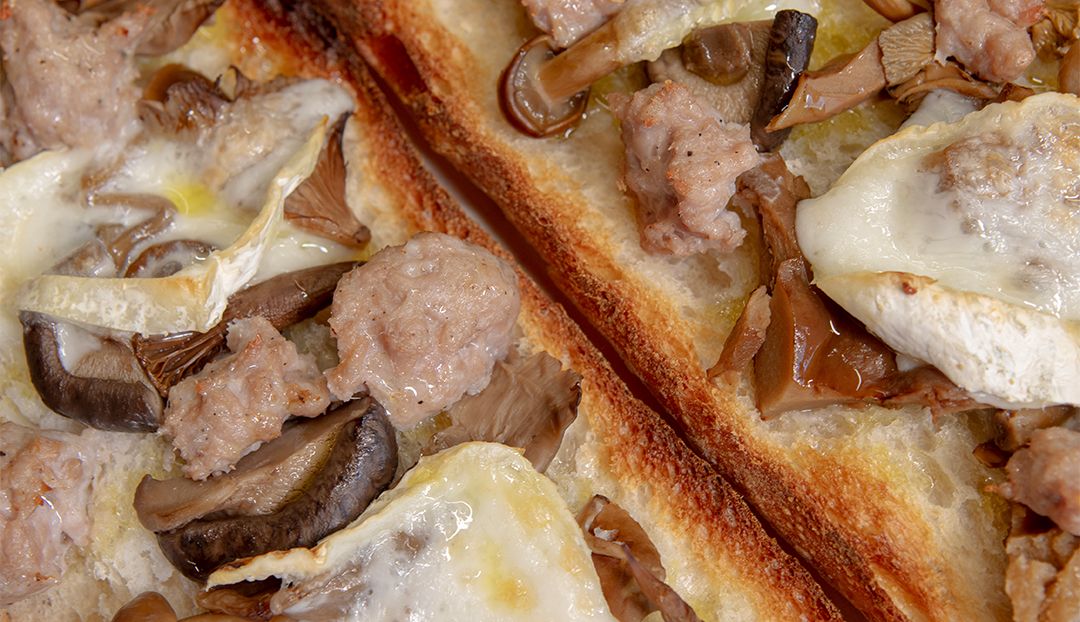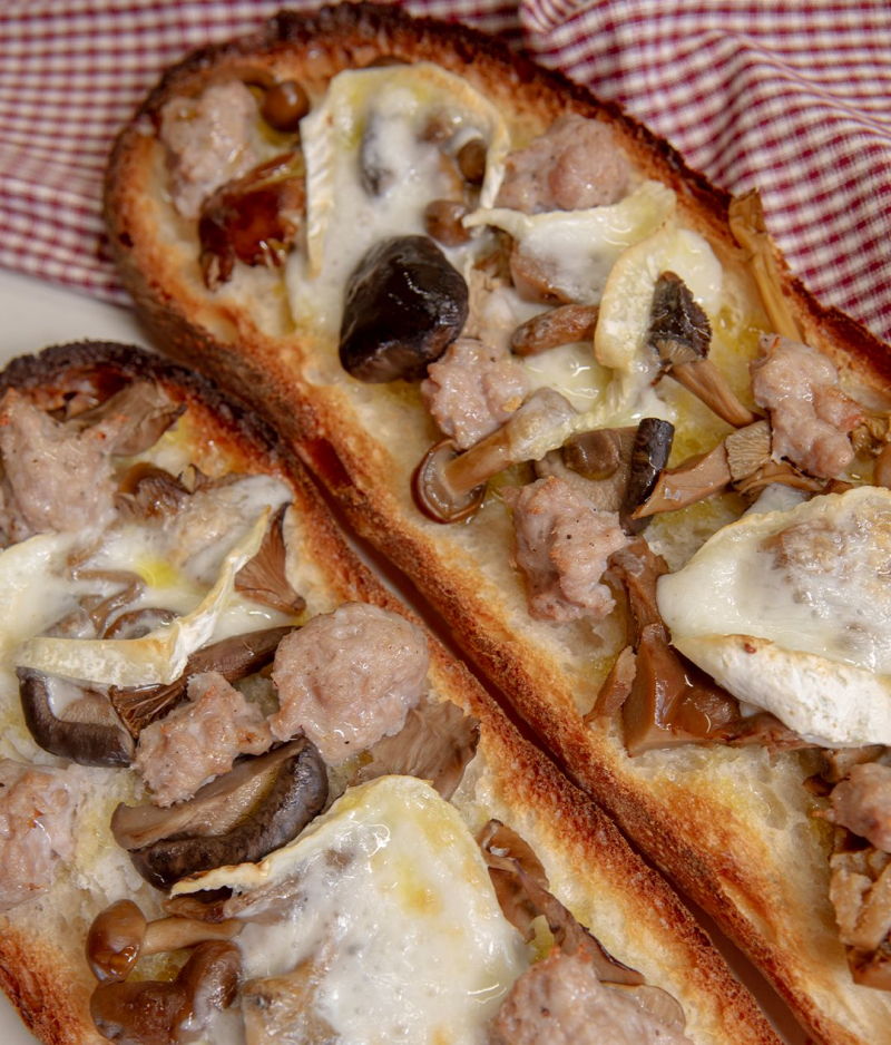 Torrada amb botifarra, bolets i formatge de cabra