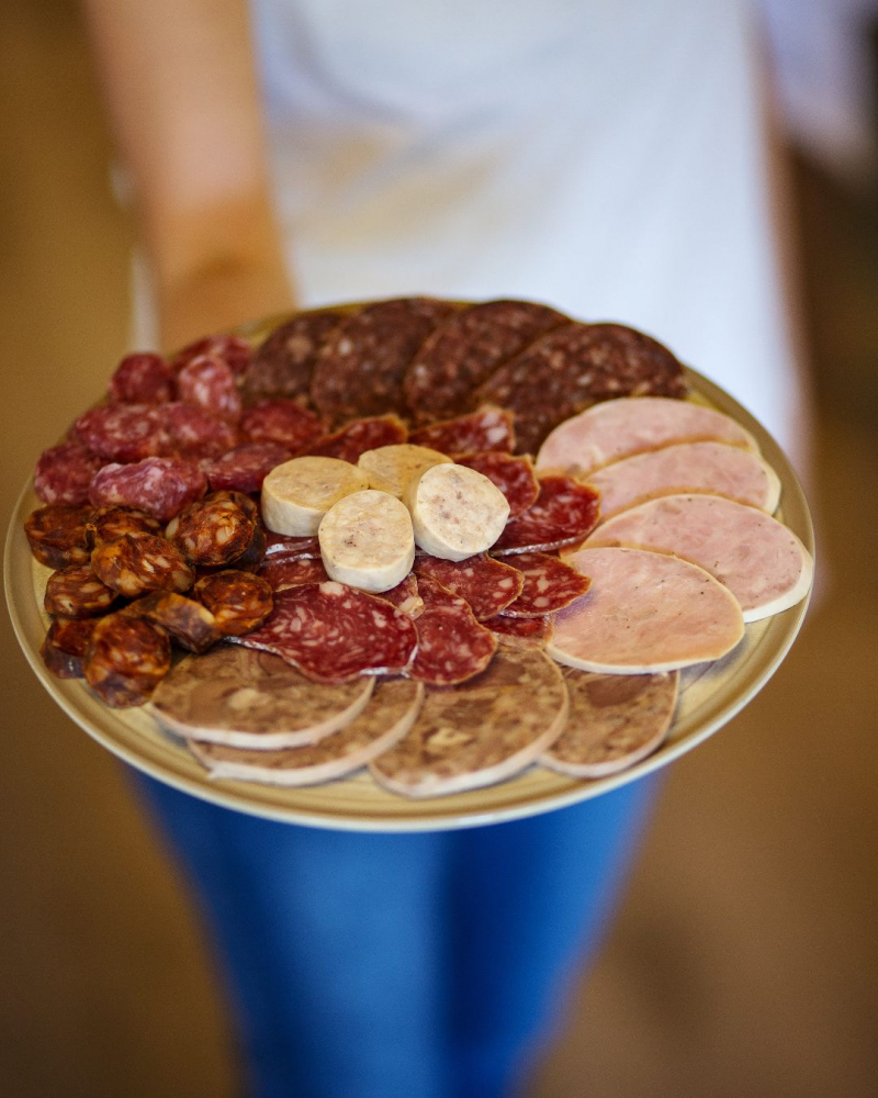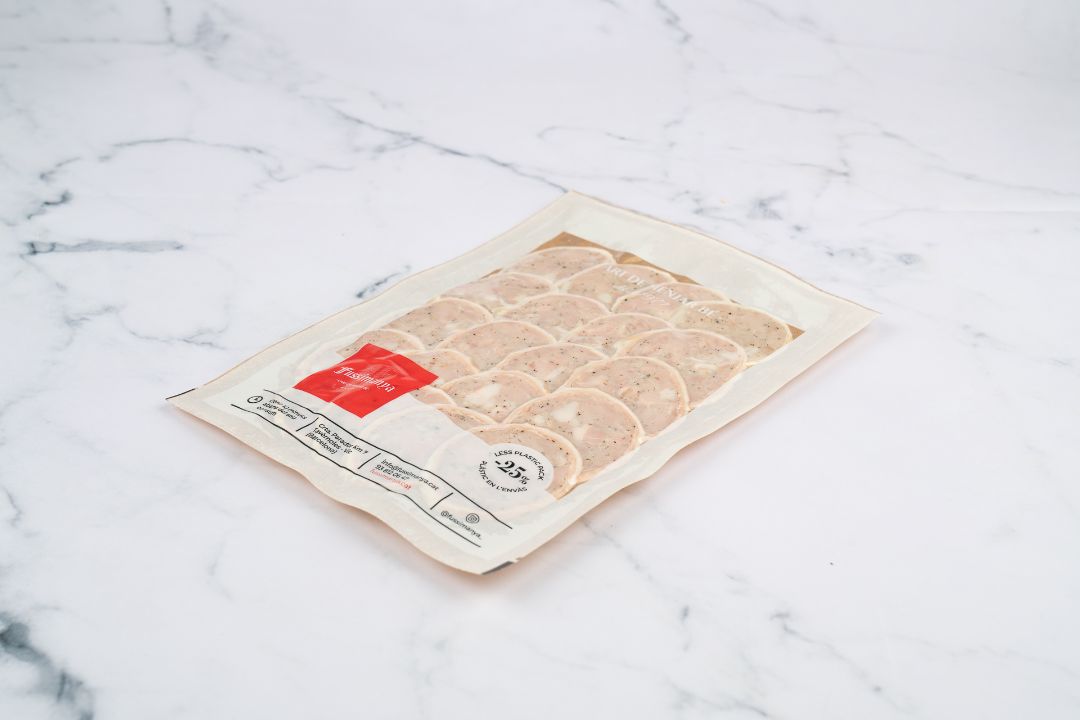 Carn magre i greix de porc, sal, tripa natural, dextrosa, fècula, pebre negre, estabilitzants (Difosfat disòdic i polifosfat sòdic), conservant (nitrit sòdic), Antioxidant (Ascorbat sòdic) i vi (SULFITS).