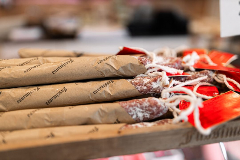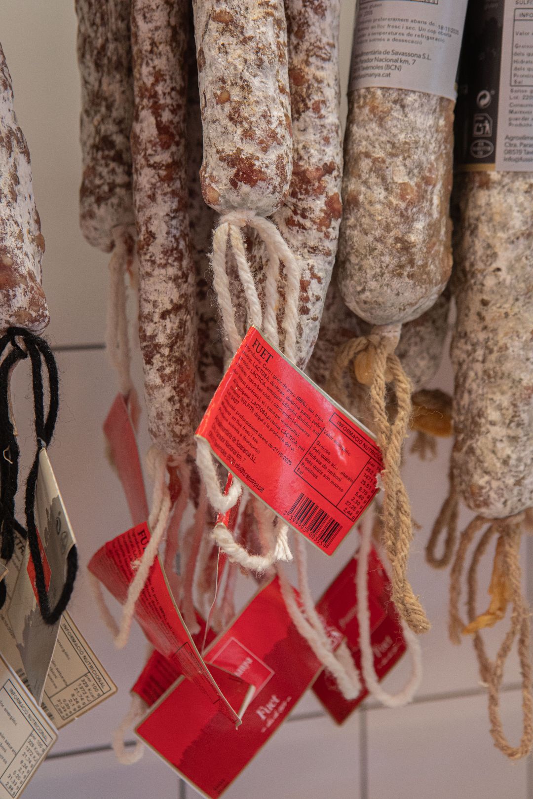 Carn i greix de porc (96%), sal, tripa natural de porc, LACTOSA, dextrosa, dextrina de panís, pebre negre, protïna LÀCTICA, emulgent (difosfat disòdic), antioxidants (ascorbat sòdic i citrat sòdic), conservador (nitrat potàssic), vi (conté SULFITS) i colorant (vermell cotxinilla).