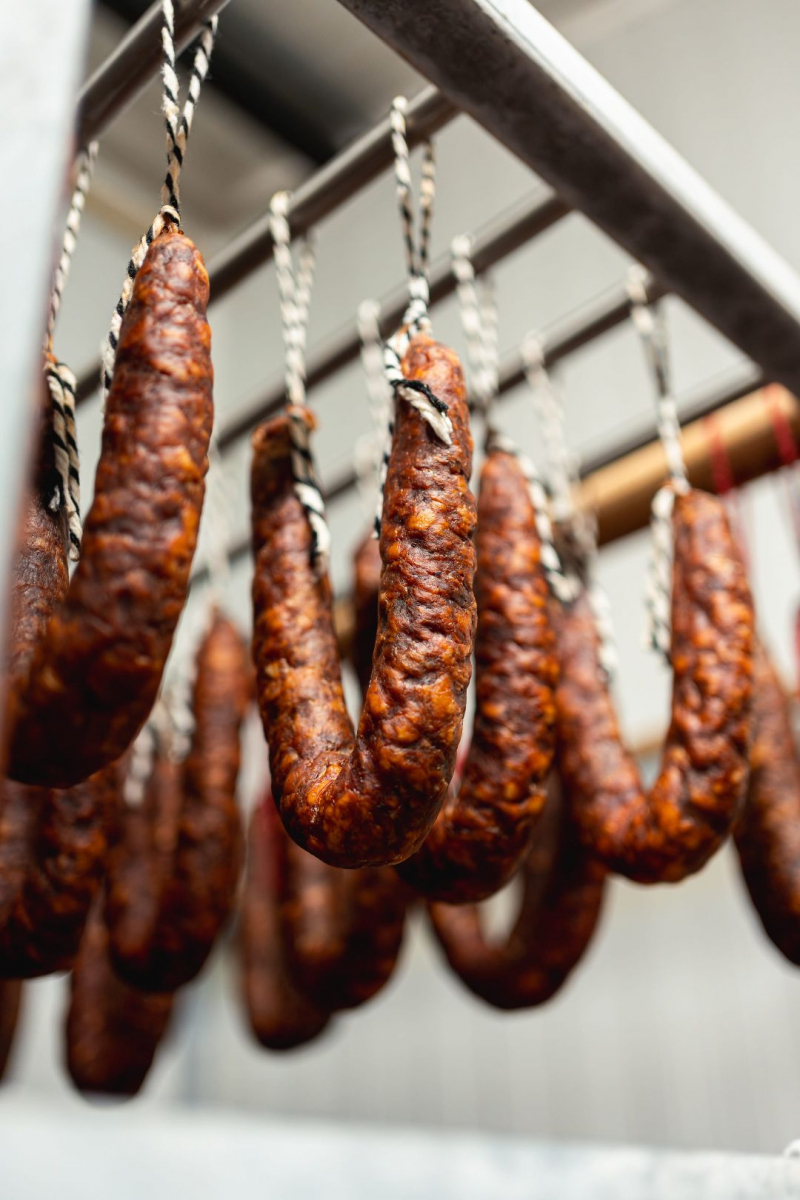 Carn i grassa de porc. Tripa natural de porc, mescla d’espècies (pebre vermell dolç, pebre negre i pebre vermell picant), sal, conservador (nitrat potàssic), antioxidant (extracte de tocoferols i oli vegetal) i vi (conté SULFITS).
